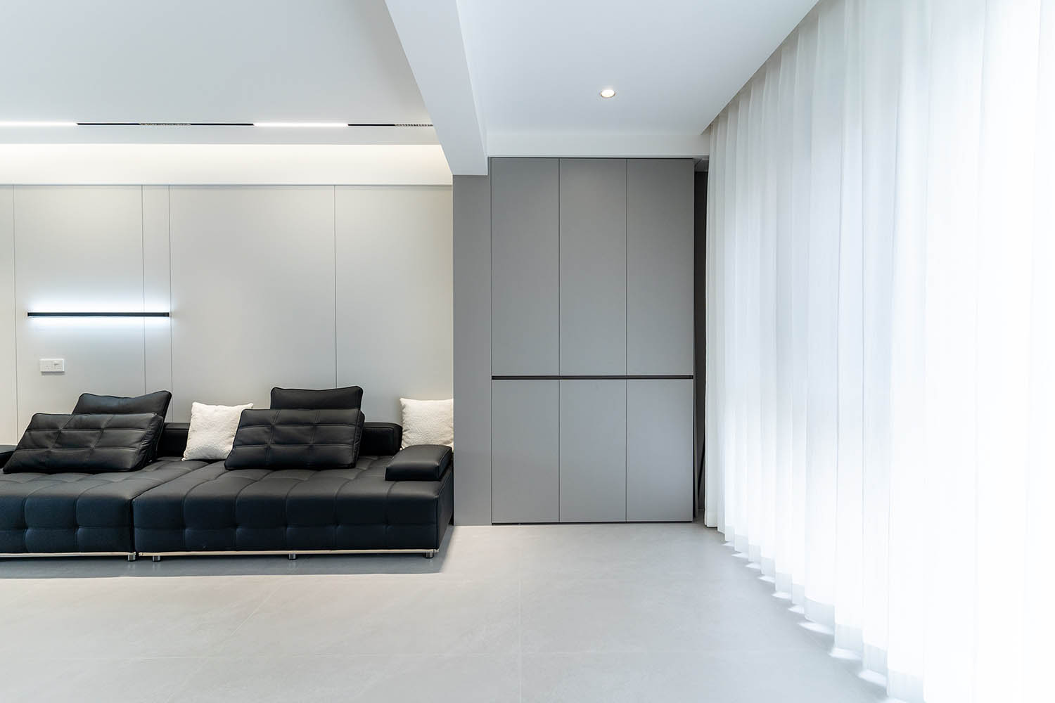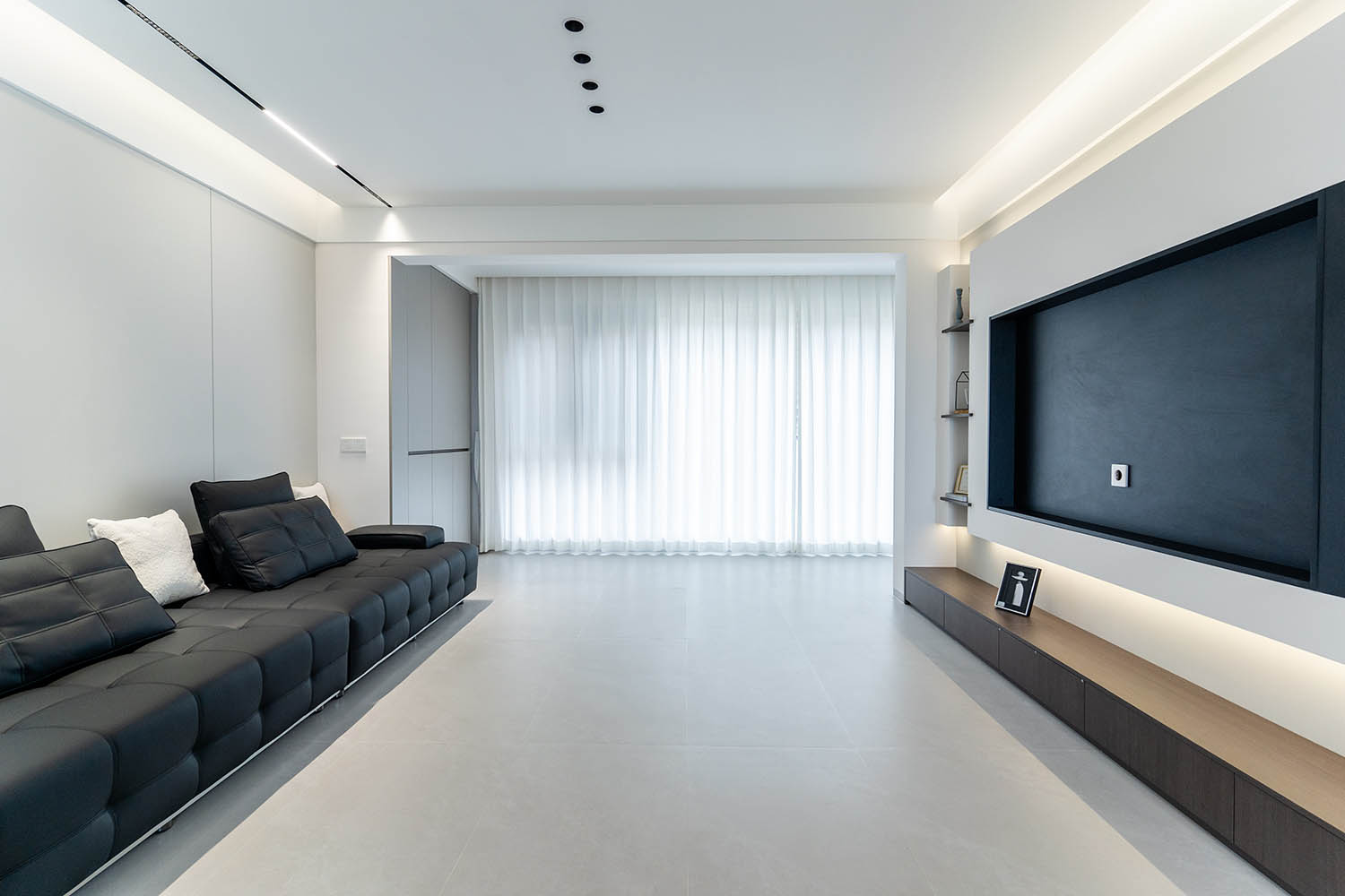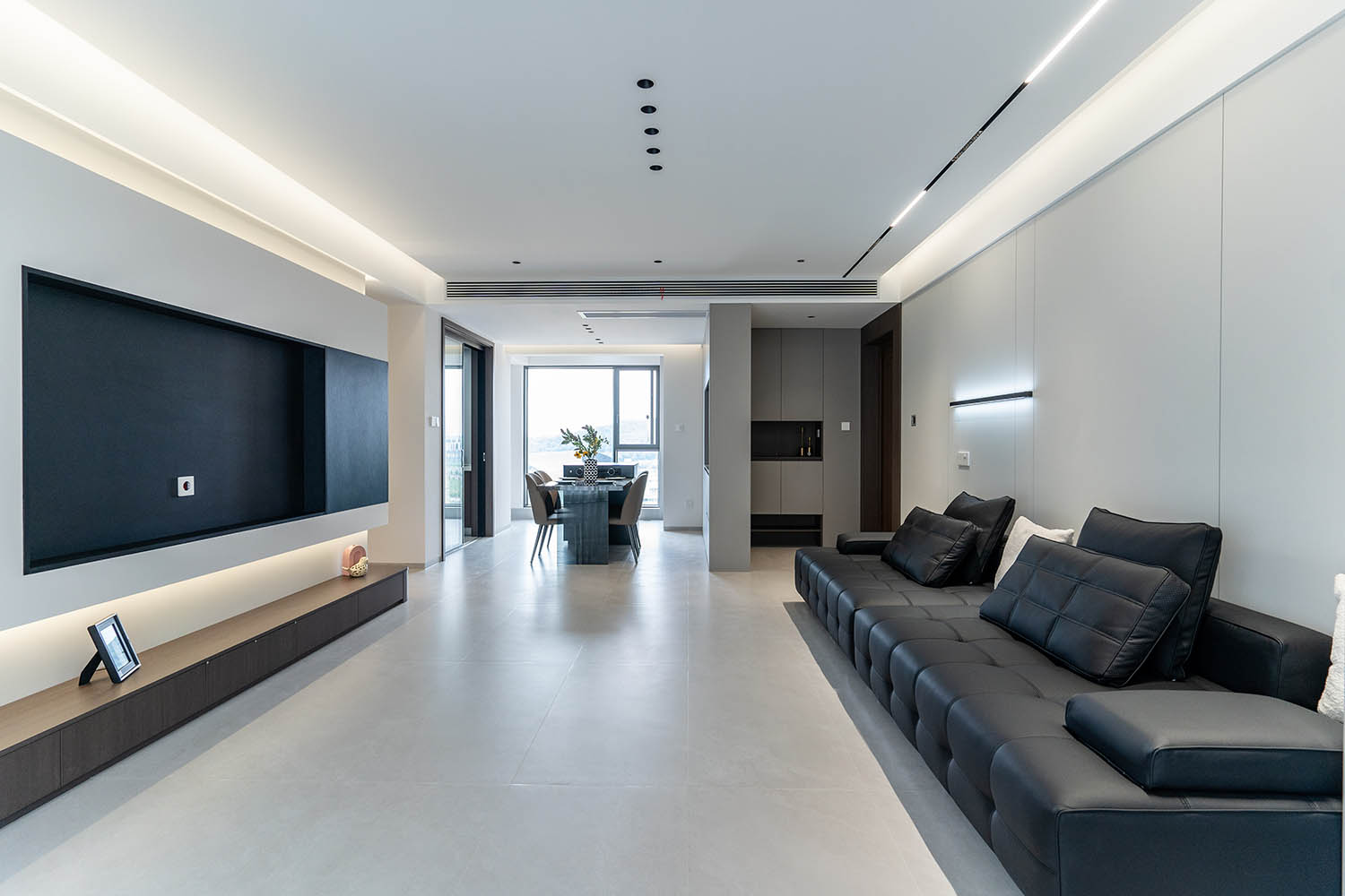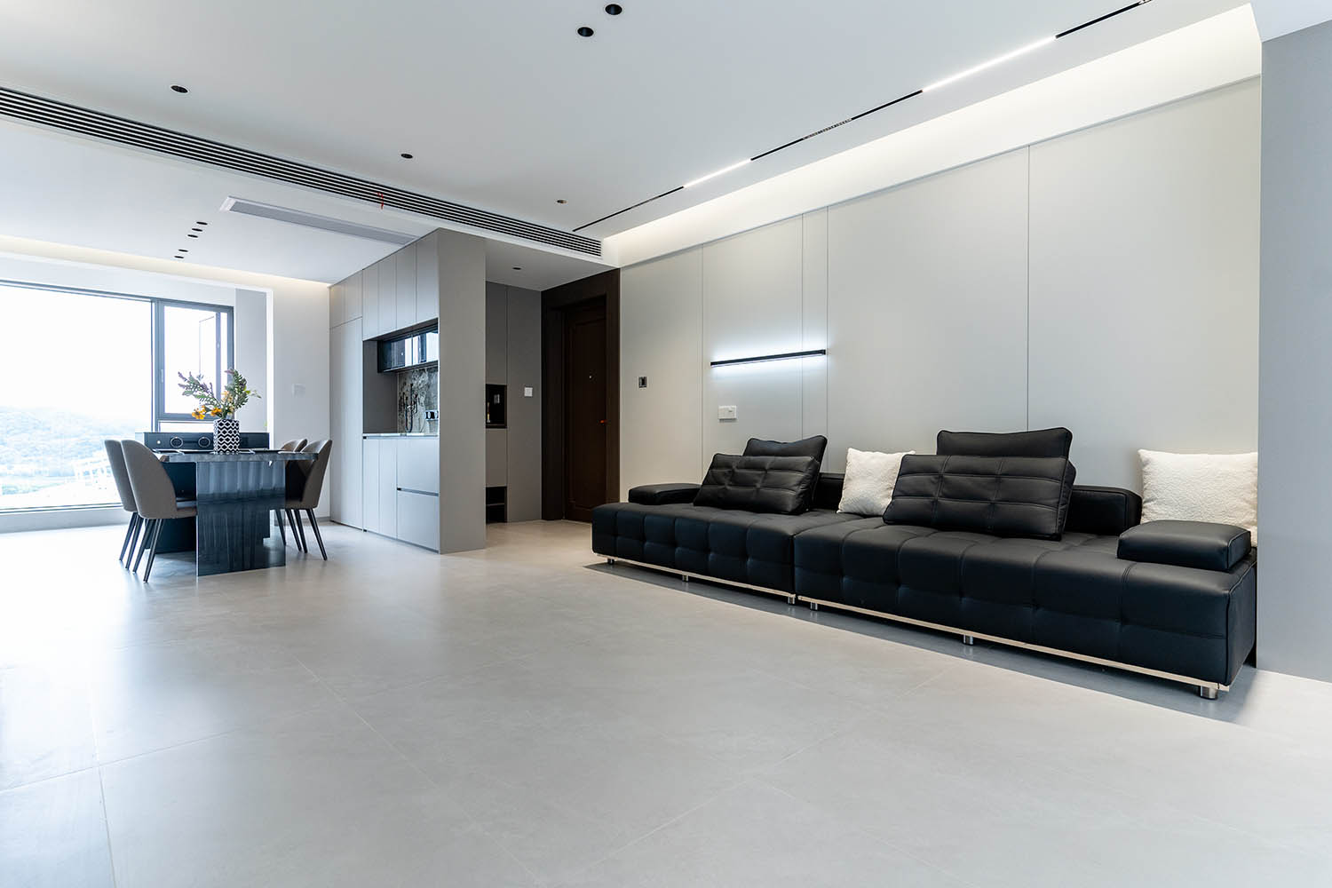 用黑、白、灰的經(jīng)典碰撞,詮釋意式極簡(jiǎn)的「做減法的藝術(shù)」。沒(méi)有冗余裝飾,以利落線(xiàn)條、純粹色調(diào),讓空間回歸「實(shí)用與質(zhì)感共生」的本質(zhì),每一處都藏著 “用必要定義高級(jí)” 的設(shè)計(jì)智慧。 無(wú)主燈設(shè)計(jì) + 線(xiàn)性燈帶,讓光線(xiàn)柔和包裹空間;黑色皮質(zhì)沙發(fā)簡(jiǎn)化形態(tài),與灰色背景墻呼應(yīng),詮釋意式「隱于簡(jiǎn)的高級(jí)感」,舍去繁雜裝飾,還原空間本真互動(dòng)場(chǎng)域。每一寸存在都值得被凝視,讓走過(guò)空間的人,忍不住贊嘆這份 “不動(dòng)聲色的精致” 。