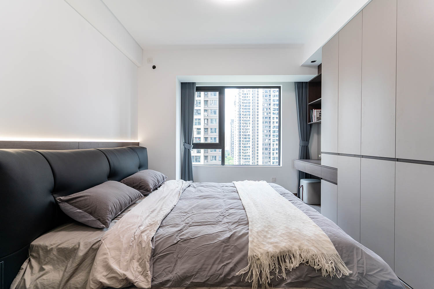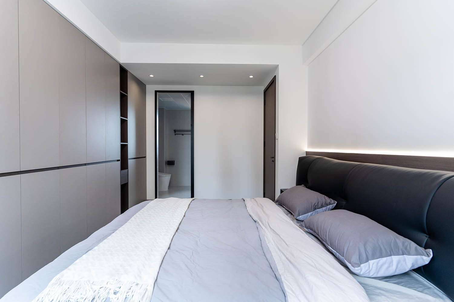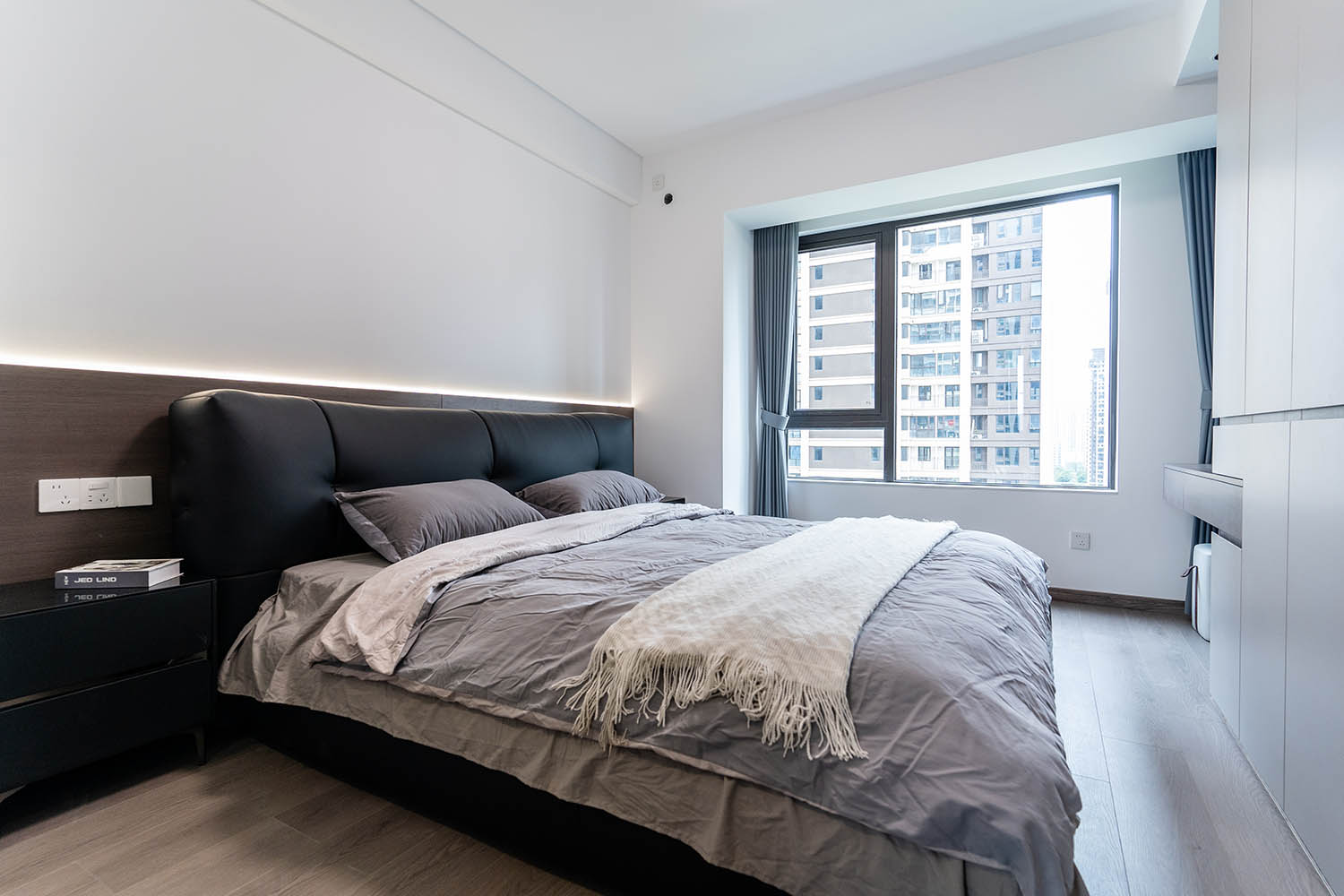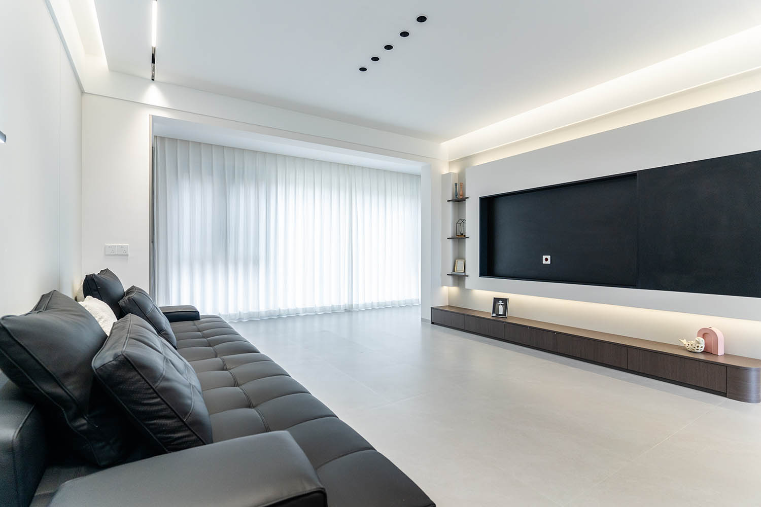 用黑、白、灰的經(jīng)典碰撞,詮釋意式極簡(jiǎn)的「做減法的藝術(shù)」。沒(méi)有冗余裝飾,以利落線(xiàn)條、純粹色調(diào),讓空間回歸「實(shí)用與質(zhì)感共生」的本質(zhì),每一處都藏著 “用必要定義高級(jí)” 的設(shè)計(jì)智慧。 無(wú)主燈設(shè)計(jì) + 線(xiàn)性燈帶,讓光線(xiàn)柔和包裹空間;黑色皮質(zhì)沙發(fā)簡(jiǎn)化形態(tài),與灰色背景墻呼應(yīng),詮釋意式「隱于簡(jiǎn)的高級(jí)感」,舍去繁雜裝飾,還原空間本真互動(dòng)場(chǎng)域。每一寸存在都值得被凝視,讓走過(guò)空間的人,忍不住贊嘆這份 “不動(dòng)聲色的精致” 。